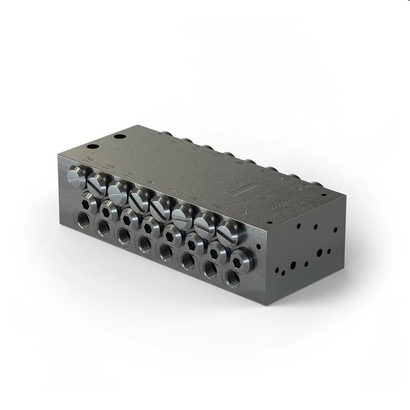 •Aantal uitlaten: 16 •Aansluiting inlaat: 1/8″G •Maximale werkdruk: 350 Bar •Aansluiting uitlaat: M10 x 1 Gebruik uitsluitend speciale SSV nippels met terugslagklep •Smeermiddel: Olie en vet tot NGLI 2 •Materiaal: Staal zwart verzinkt •Temperatuur: -25 tot 70ºC