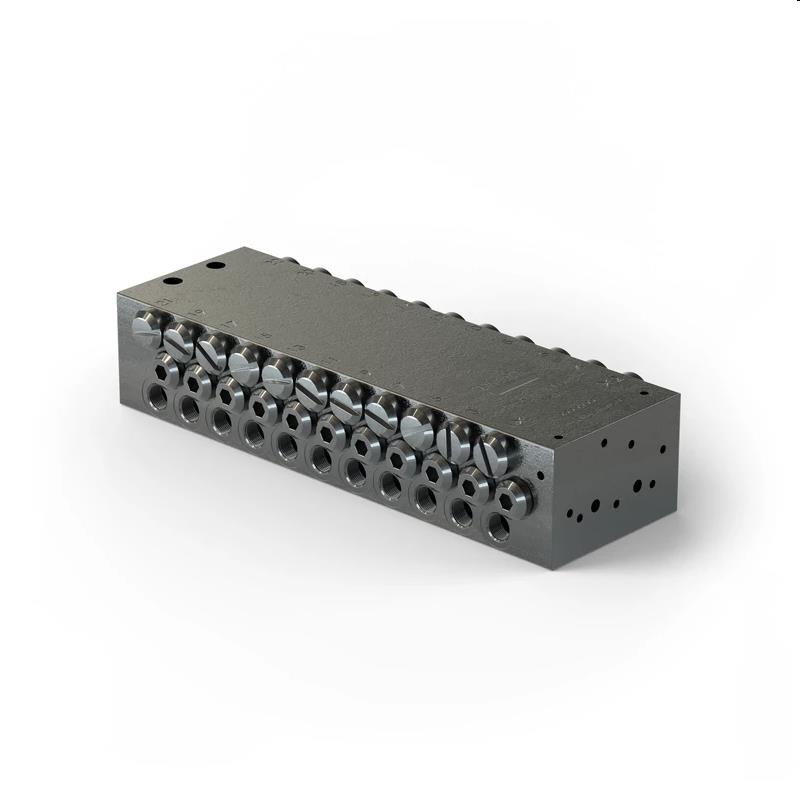 •Aantal uitlaten: 22 •Aansluiting inlaat: 1/8″G •Maximale werkdruk: 350 Bar •Aansluiting uitlaat: M10 x 1 Gebruik uitsluitend speciale SSV nippels met terugslagklep •Smeermiddel: Olie en vet tot NGLI 2 •Materiaal: Staal zwart verzinkt •Temperatuur: -25 tot 70ºC